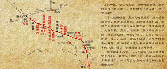 商於古道,為古代的軍事、政治、商賈之道,其歷史可追溯到春秋戰(zhàn)國時(shí)期。該古道由陜西省商洛市(古時(shí)亦稱上洛郡、上洛侯國、洛州、“商州”)通往河南省內(nèi)鄉(xiāng)縣柒於鎮(zhèn),全長約六百里。