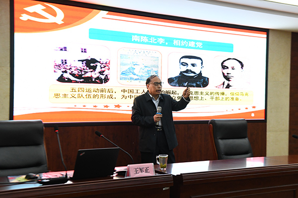 王軍正教授結(jié)合自己多年對(duì)黨史研究知識(shí)積累,結(jié)合豐富的史實(shí)、以特色鮮明的觀點(diǎn)和生動(dòng)的語言陳述,從應(yīng)運(yùn)而生、開天辟地;波瀾壯闊、驚天動(dòng)地;追夢(mèng)圓夢(mèng)、頂天立地三個(gè)方面,系統(tǒng)解讀了中國共產(chǎn)黨由誕生、發(fā)展、壯大到建立新中國,以及帶領(lǐng)全國人民建設(shè)小康社會(huì)百年艱苦卓絕的風(fēng)雨歷程。