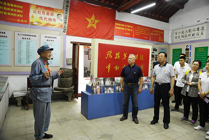 隨后,伴著蜿蜒的盤山公路,同志們來到了丹鳳縣庾嶺鎮(zhèn)“春茂永”中藥鋪,也是中共鄂豫皖省委第十八次常委會(huì)議舊址,聆聽了共產(chǎn)黨員楊青山同志的講解,跟隨楊青山同志參觀了紅二十五軍戰(zhàn)斗遺址,身臨其境的感受了當(dāng)時(shí)紅二十五軍在庾家河戰(zhàn)役中的艱難處境及戰(zhàn)士們殊死奮戰(zhàn)、不怕犧牲、奮勇當(dāng)前的英勇精神。庾嶺山脊上靜默的無名烈士墓、掩藏于樹叢中的庾家河戰(zhàn)斗紀(jì)念亭,以及程子華、徐海東受傷處的紀(jì)念碑,這一切都在向每位黨員訴說著那段不平凡的歲月。在庾家河戰(zhàn)斗紀(jì)念碑前,全體黨員同志舉起右手,莊嚴(yán)宣誓,重溫了入黨誓詞,鏗鏘有力的聲音回響在于家河上空以告慰英靈。